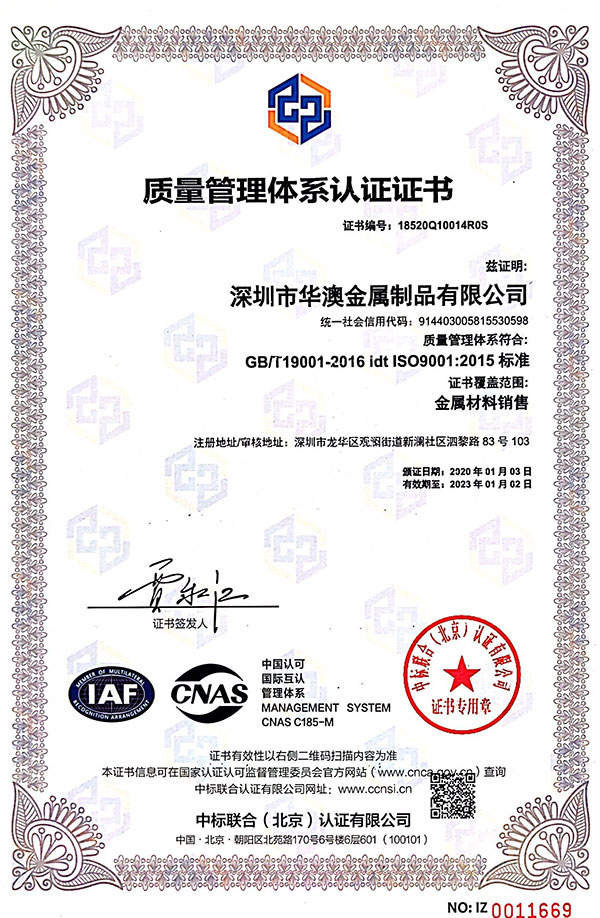 深圳市華澳金屬制品有限公司成立于2011年,擁有20多人的研發(fā)團隊,10+年專注金屬原材料生產(chǎn)經(jīng)驗,主打產(chǎn)品系列包含:鋁合金系列、不銹鋼系列、鈦合金系列,并通過ISO質(zhì)量管理體系認(rèn)證9001:2015,產(chǎn)品符合“SGS"、"RoHS"環(huán)保認(rèn)證。